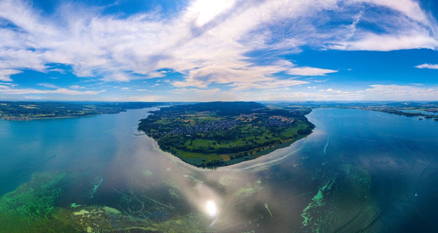 Essen, radeln, essen, radeln – erst der stete Wechsel macht dieses Menü zum perfekten Genuss. Der Weg führt weiter ins Hinterland, durch Wälder, an Feldern vorbei, durch noch winzigere Dörfer – und auf einmal sogar ordentlich bergauf. Ganz oben dann, am Horner Wasserturm, der Lohn für die Anstrengung: Das ist wirklich der beste Rundblick über den westlichen Bodensee, bis zur Halbinsel Mettnau, zur Insel Reichenau und zum thurgauischen Seerücken.