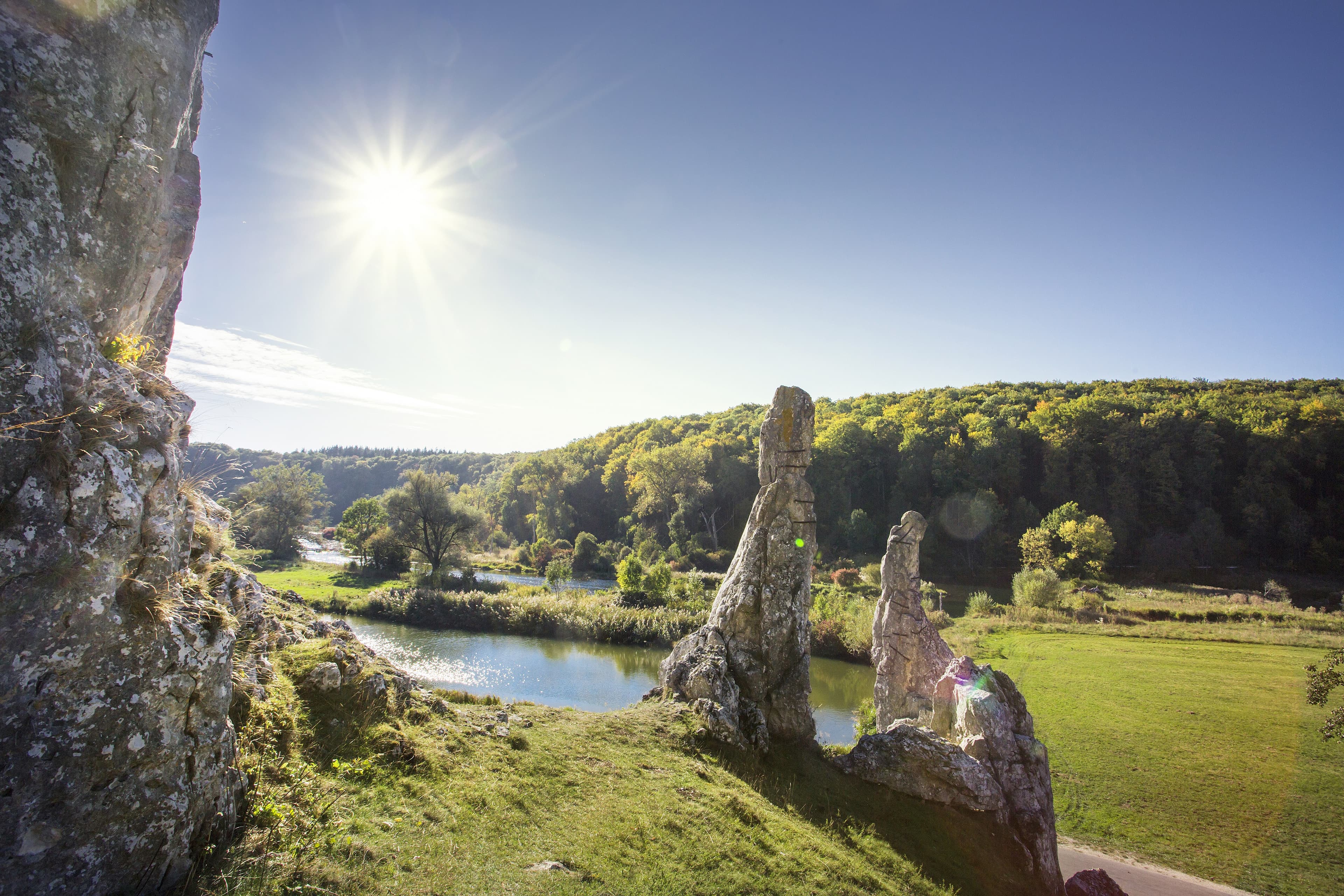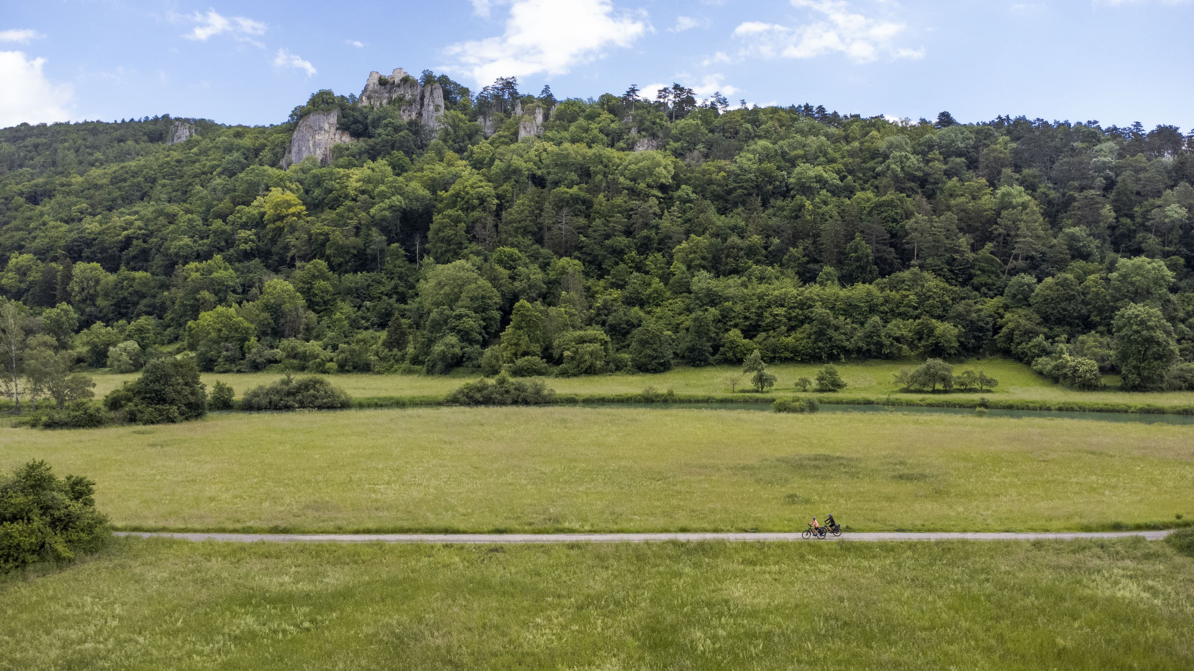 As the two friends push their bikes along the tarmac road after their long break, the light has changed. The green and beige tones of the summer landscape seem to have become warmer and softer. After a couple of bends in the road and a quick stop to watch cows eating in a pasture, they leave the village behind them and are once again surrounded by nature. A short time later, they arrive at the Steinerne Jungfrauen, literally the ‘stone virgins’, one of the highlights of the second stage of the cycle trial. These two pointed rock cones rise up towards the sky, right next to the cycle trail. Simone is fascinated by myths and legends and knows the grisly story about the rocks that the people of the valley have come up with. “They are supposed to be two of the maids of the former lady of Eselsburg Castle,” she explains. “The lady of the castle hated men and is said to have banned even her maids from having contact with any male beings. Unfortunately, the two young maids fell in love with two lads they met on their regular trips to gather water in the valley.” Simone gulps: “The lady of the castle is said to have turned them to stone as a punishment for their disobedience.”